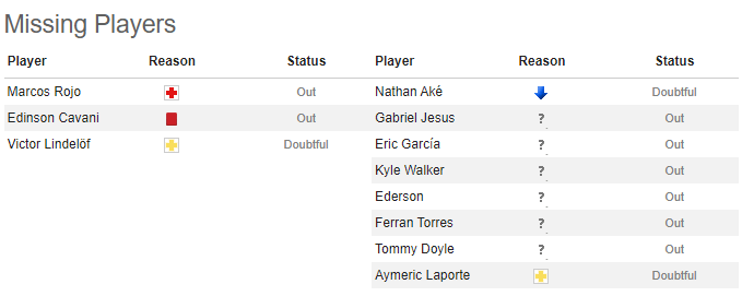 확실히 맨시티가 코로나 확진자로 인한 전력손실이 심합니다. 맨유는 카바니 선수의 3경기 중징계로 인한 손실이 있구요