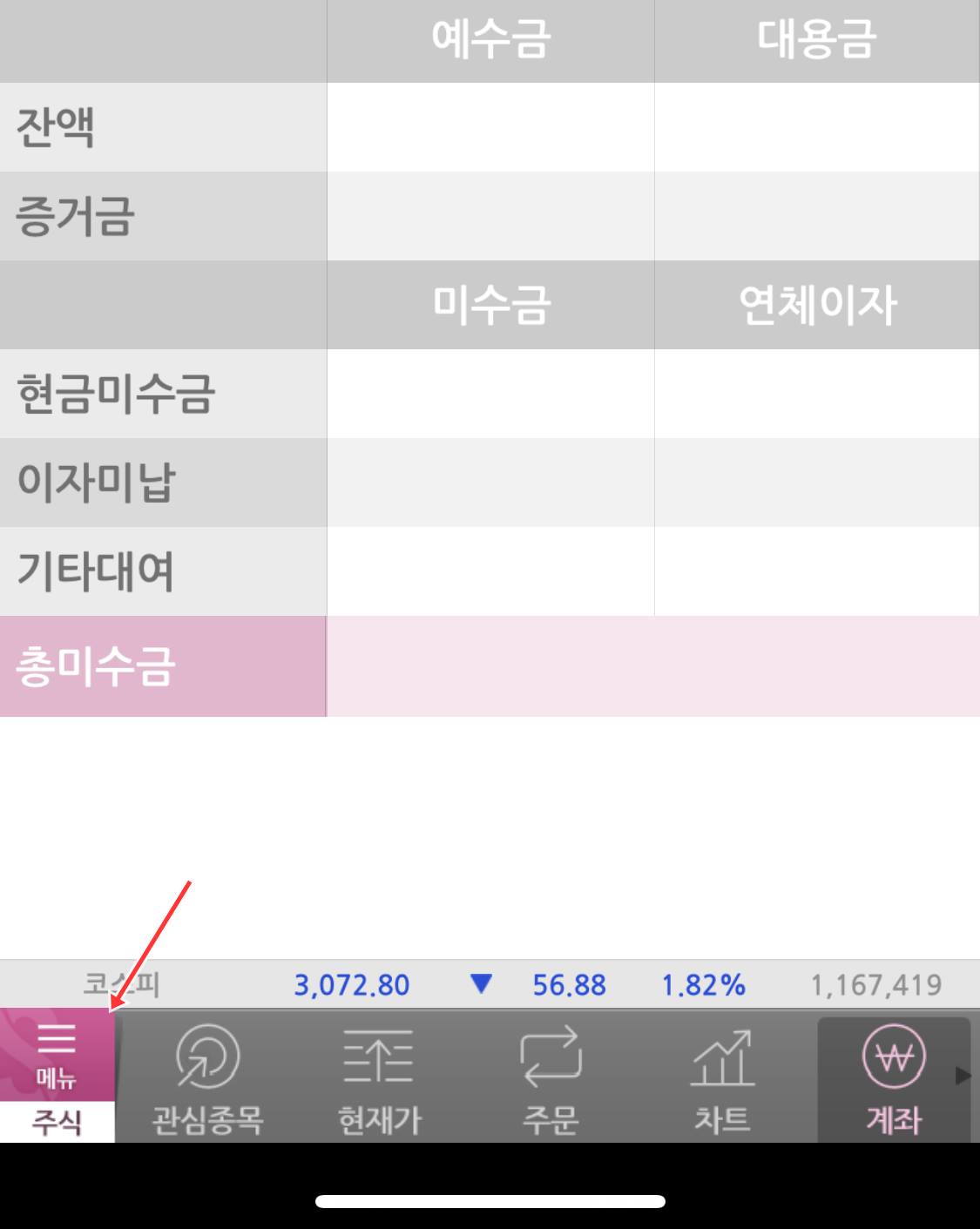 다시 본래 화면으로 와서 좌측 하단에 [ 주식 메뉴 ] 로 이동을 해주세요